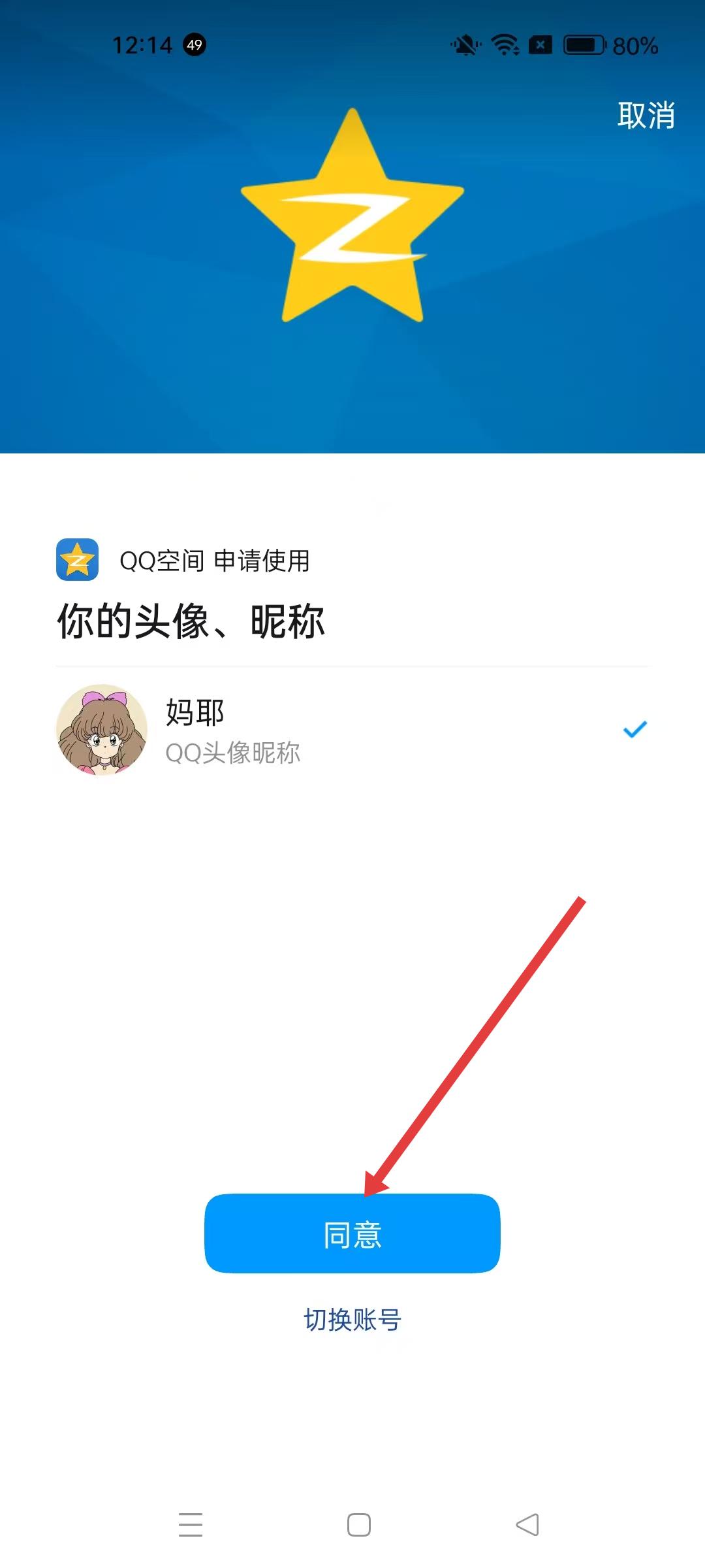 2、進(jìn)入QQ授權(quán)界面,界面顯示QQ空間申請(qǐng)使用你的頭像、昵稱,確認(rèn)當(dāng)前登錄的QQ賬號(hào)信息無(wú)誤后,點(diǎn)擊同意按鈕,完成授權(quán)操作,從而成功登錄QQ空間。