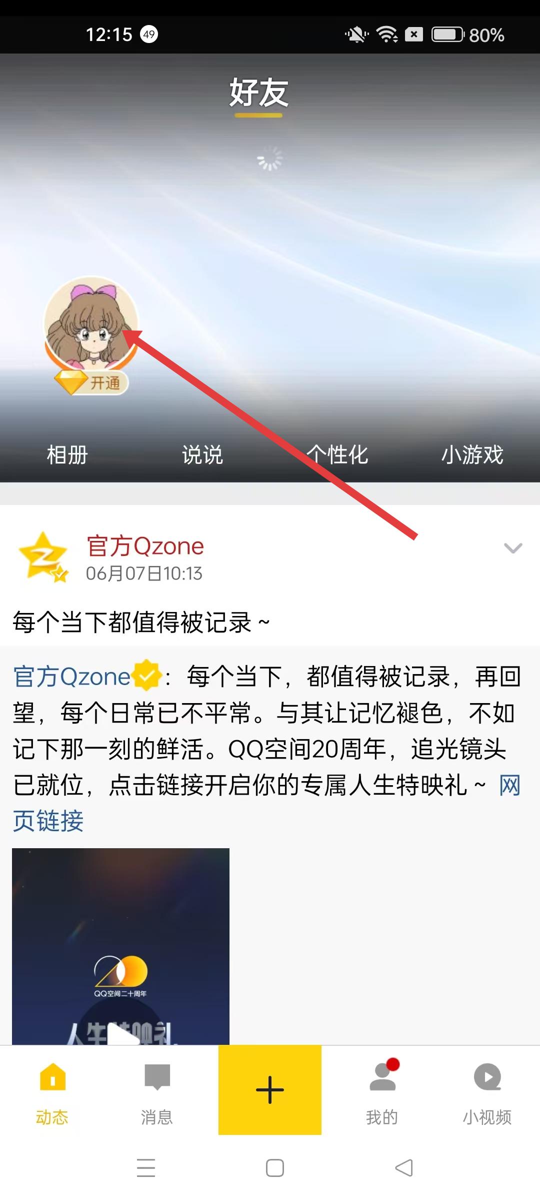3、登錄成功后,進(jìn)入好友界面,該界面展示了好友動(dòng)態(tài)、相冊(cè)、說(shuō)說(shuō)、個(gè)性化、小游戲等板塊,點(diǎn)擊個(gè)人頭像,彈出包含我的空間和取消的操作選項(xiàng)。
