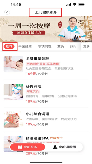 1、上門健康服務(wù)APP頁,有中醫(yī)推拿、艾灸等分類,推薦全身推拿調(diào)理169元 、60分鐘腸胃調(diào)理等項(xiàng)目,可選服務(wù)或調(diào)理師。