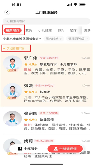 2、按摩理療頁展示郭廣偉、張媛等多位4.9高分調(diào)理師,清晰呈現(xiàn)師資信息,用戶可直接點(diǎn)擊預(yù)約對(duì)應(yīng)服務(wù)。