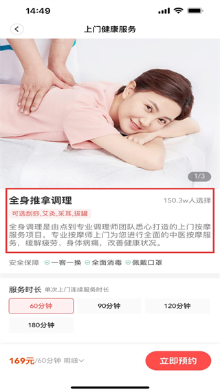 3、全身推拿調(diào)理頁含刮痧、艾灸等,60分鐘169元,專業(yè)調(diào)理師上門按摩,緩解疲勞可立即預(yù)約。
