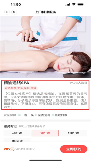 4、精油通絡(luò)SPA頁僅限女性,含刮痧、艾灸等,90分鐘289元,精選精油調(diào)理,舒緩身心可立即預(yù)約。
