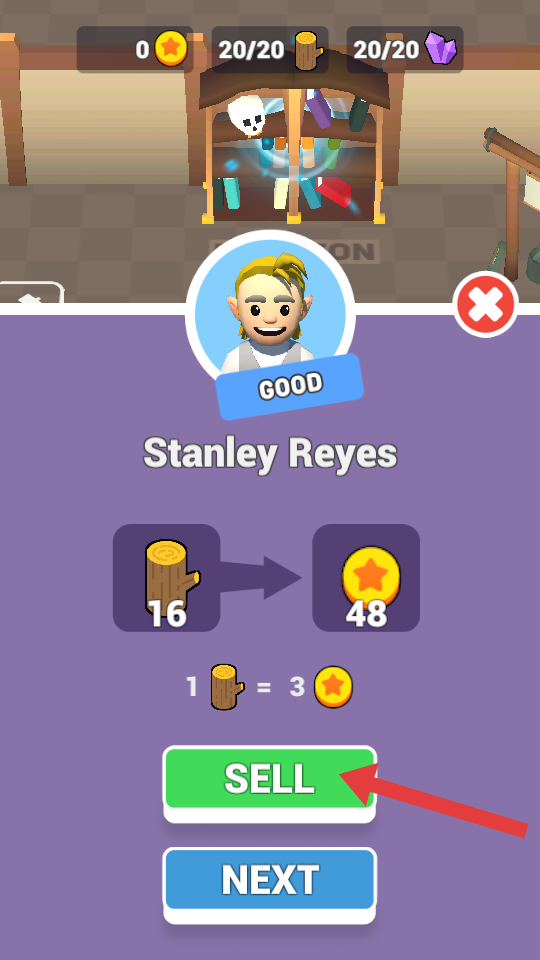 4、之后可進(jìn)入交易界面,將收集到的木樁賣給NPC,按照1個(gè)木樁換3個(gè)金幣的比例,點(diǎn)擊SELL按鈕完成交易獲取金幣。