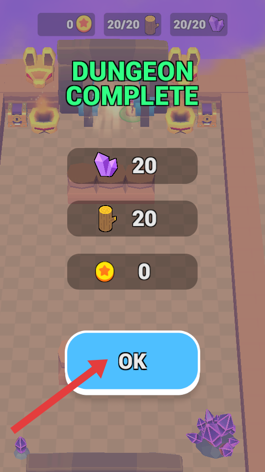 3、當(dāng)完成地牢內(nèi)所有收集任務(wù)后,會(huì)彈出任務(wù)完成的提示界面,顯示收集到的水晶、木樁數(shù)量,點(diǎn)擊OK即可。