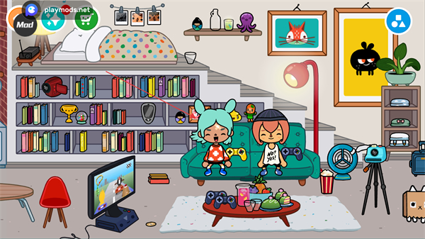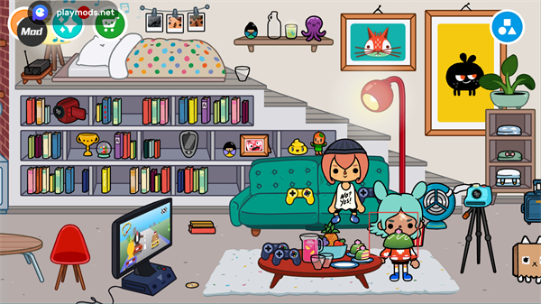 2、進(jìn)入托卡世界后在房間里,可以與各種物品互動(dòng)比如打開書架上的書,拿起桌上的游戲手柄,模擬角色玩游戲等。
