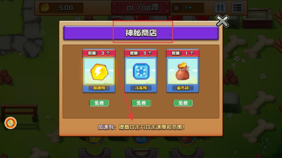 4、在關(guān)卡過程中進(jìn)入神秘商店界面,領(lǐng)取免費(fèi)的加速劑等道具,這些道具能提高攻擊力、攻擊速度和范圍,助力更好地完成守衛(wèi)任務(wù)。