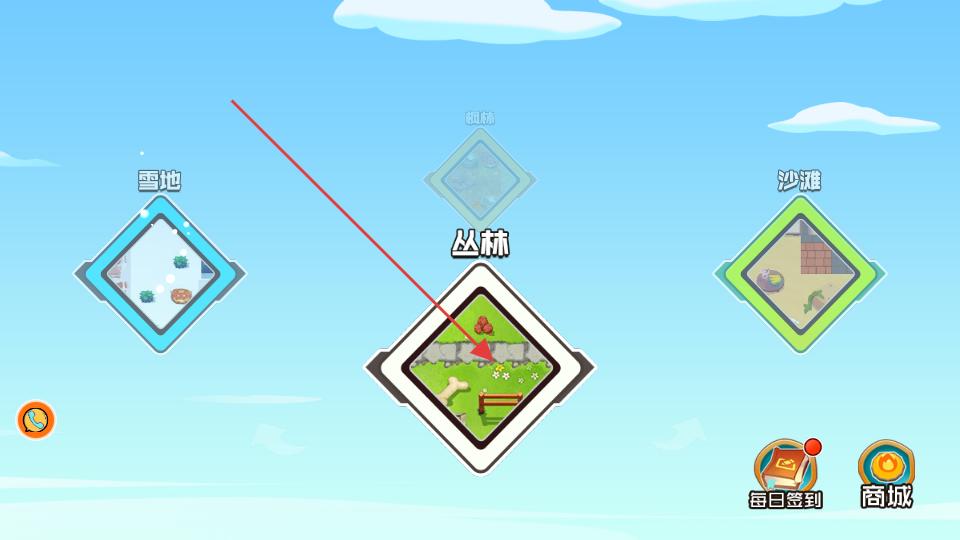 1、在游戲初始界面點(diǎn)擊開始游戲按鈕,進(jìn)入場景選擇頁面,此時能看到雪地、叢林、沙灘等不同場景,準(zhǔn)備挑選要冒險的區(qū)域。