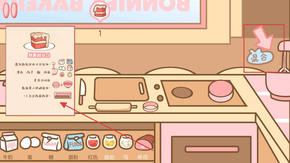 3、根據(jù)選中的糕點配方,從食材欄選取對應(yīng)的材料,比如制作蜂蜜蛋糕需要的面粉、蛋等,然后點擊右側(cè)的混合按鈕,將材料放入攪拌器進行混合。
