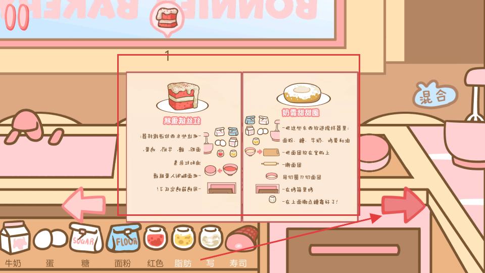 2、進入面包店后查看下方的食材欄,里面有牛奶、蛋、糖、面粉等食材,再看上方的糕點配方,了解制作蜂蜜蛋糕、奶油甜甜圈等糕點需要的材料和步驟。