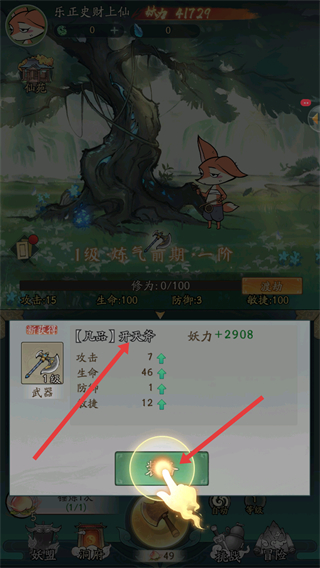 4、錘煉后會獲得武器等裝備,界面會顯示裝備的攻擊、生命、防御、敏捷等屬性,以及妖力增加情況,助力角色提升實力。