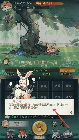 2、與仙樹進行錘煉,裝備會顯現(xiàn)出來,再次錘煉還能獲得更新的裝備,界面會有相關(guān)提示,幫助了解錘煉與裝備的關(guān)系。