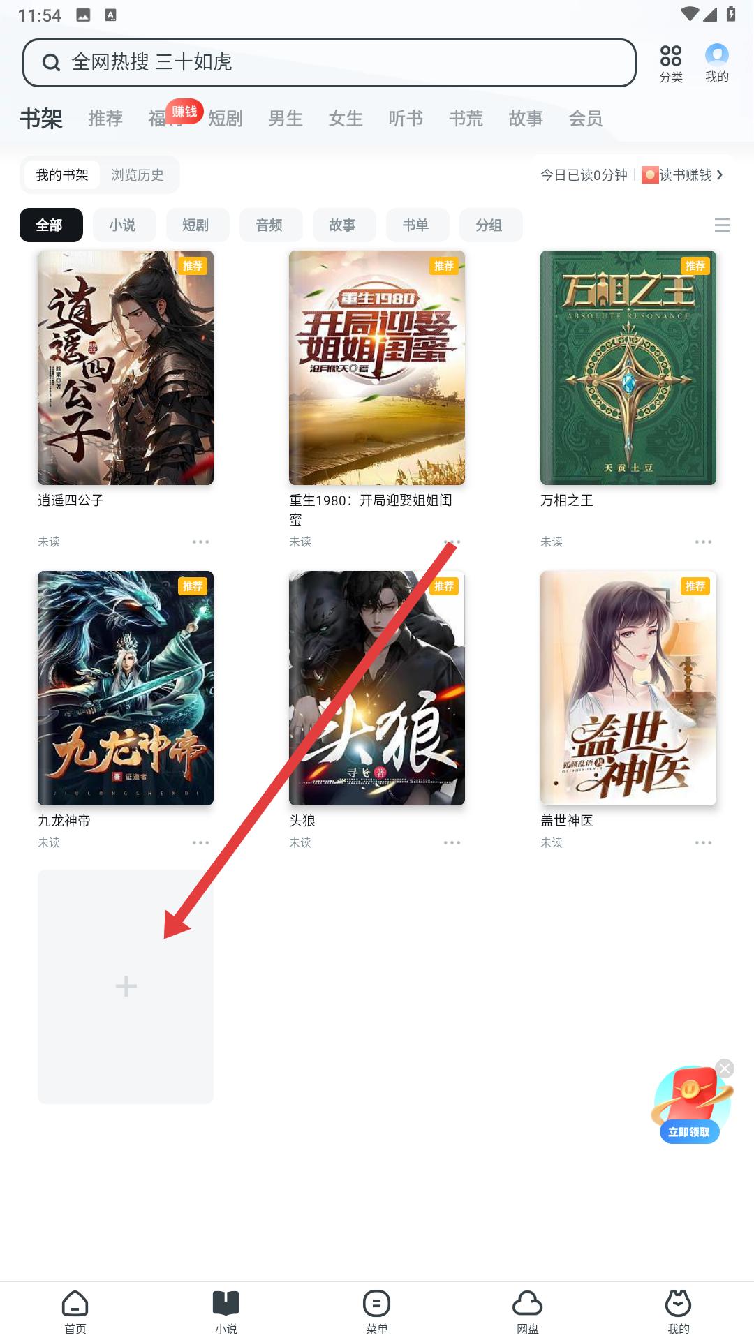 2、進(jìn)入小說頁面后,在上方找到書架選項(xiàng),點(diǎn)擊該選項(xiàng),進(jìn)入書架界面。