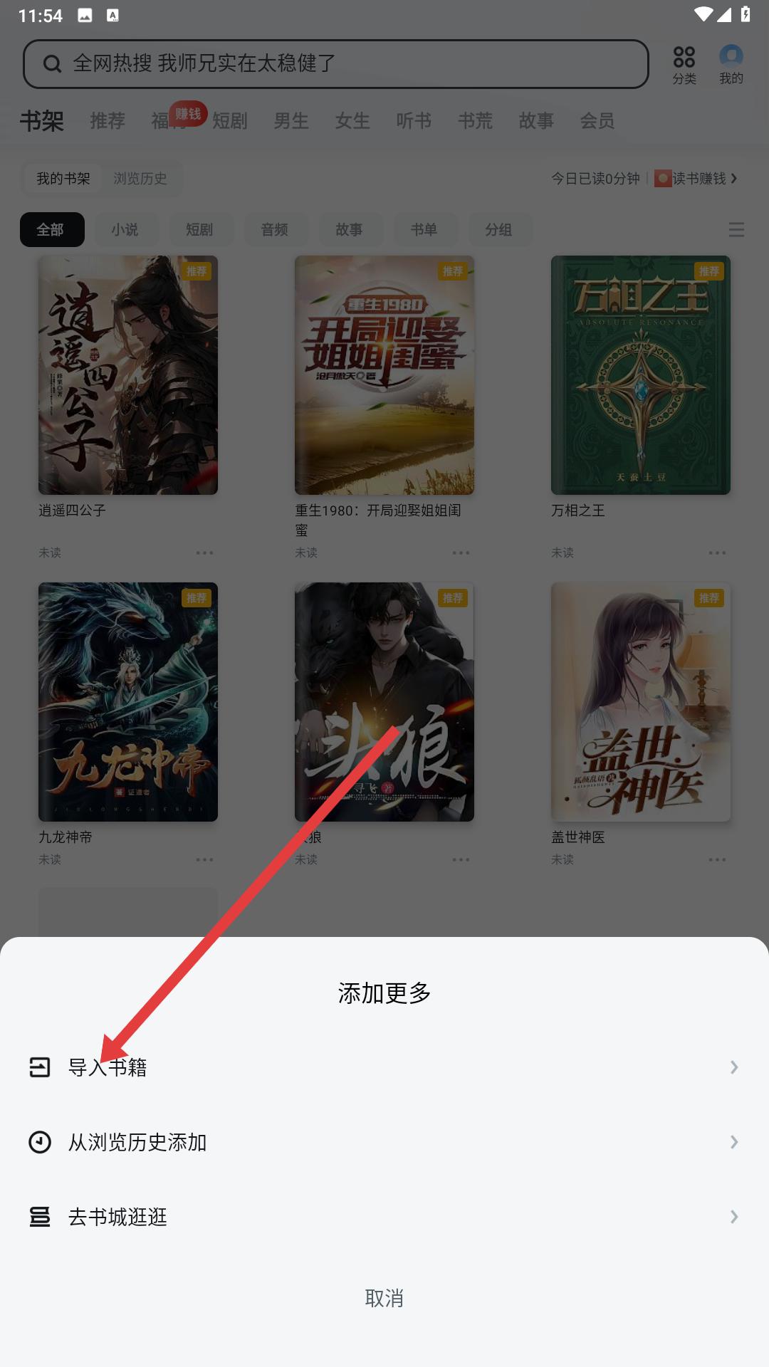 4、彈出的選項(xiàng)里有導(dǎo)入書籍,點(diǎn)擊導(dǎo)入書籍,就可以將外部書籍導(dǎo)入到UC書架中。