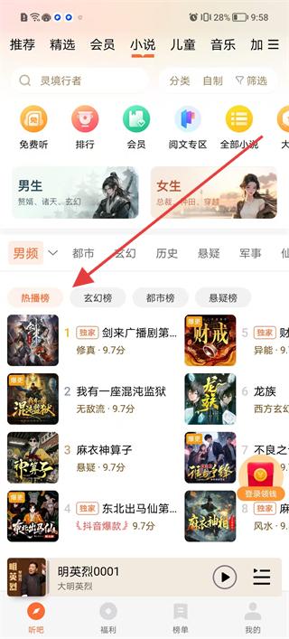 3、進(jìn)入小說頁面可查看男生、女生分類的聽書內(nèi)容,如男生的玄幻榜、都市榜等榜單作品,選擇心儀的小說聽書內(nèi)容開始收聽。