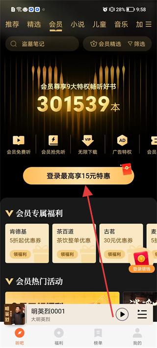 2、進(jìn)入會(huì)員板塊可了解會(huì)員尊享的9大特權(quán),如會(huì)員免費(fèi)聽、會(huì)員搶先聽等,點(diǎn)擊登錄按鈕,登錄后最高享15元特惠。