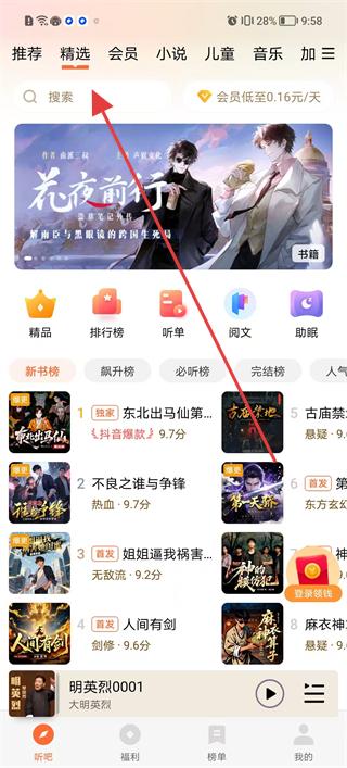 1、進(jìn)入精選板塊,可瀏覽新書榜、飆升榜等榜單的聽書內(nèi)容,如東北出馬仙等,也可使用搜索功能查找感興趣的聽書作品。
