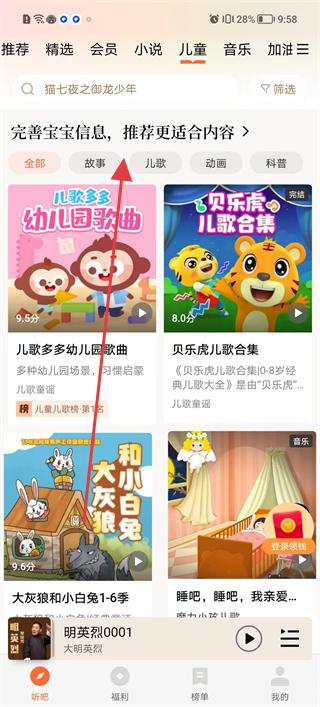 4、進(jìn)入兒童板塊可完善寶寶信息獲取更適合的內(nèi)容推薦,瀏覽故事、兒歌、動(dòng)畫等分類的兒童聽書內(nèi)容,如幼兒園歌曲、貝樂虎兒歌合集等。