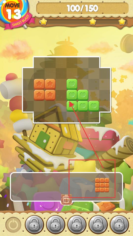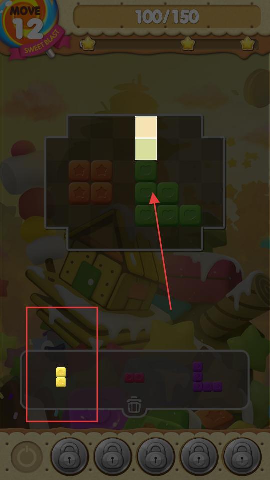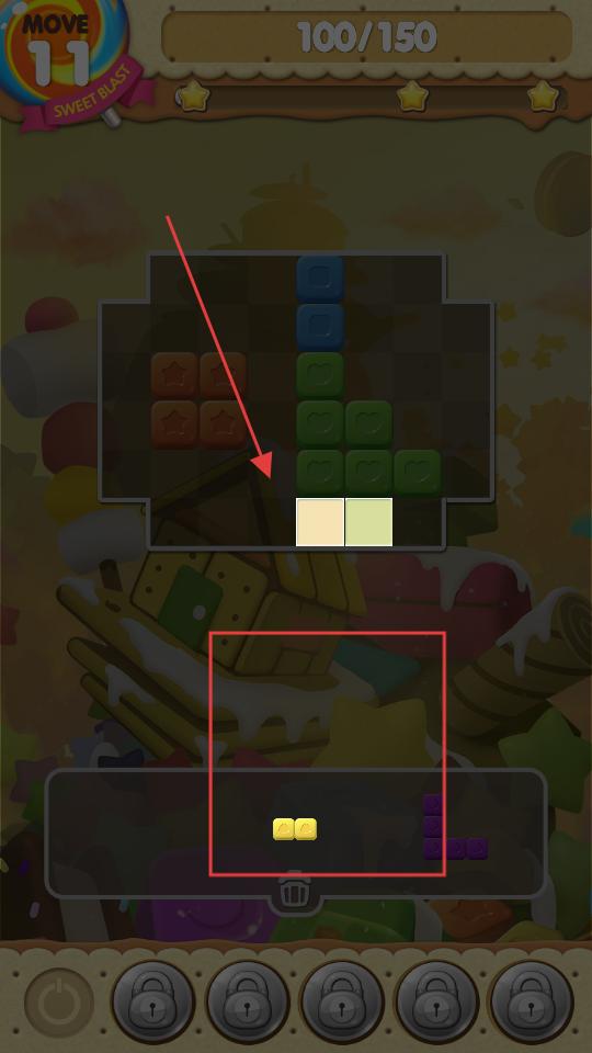 1、進入游戲后看到下方有不同形狀的方塊,選擇左側的方塊,將其拖動到上方綠色糖果的合適位置,為后續(xù)的消除操作做好準備。