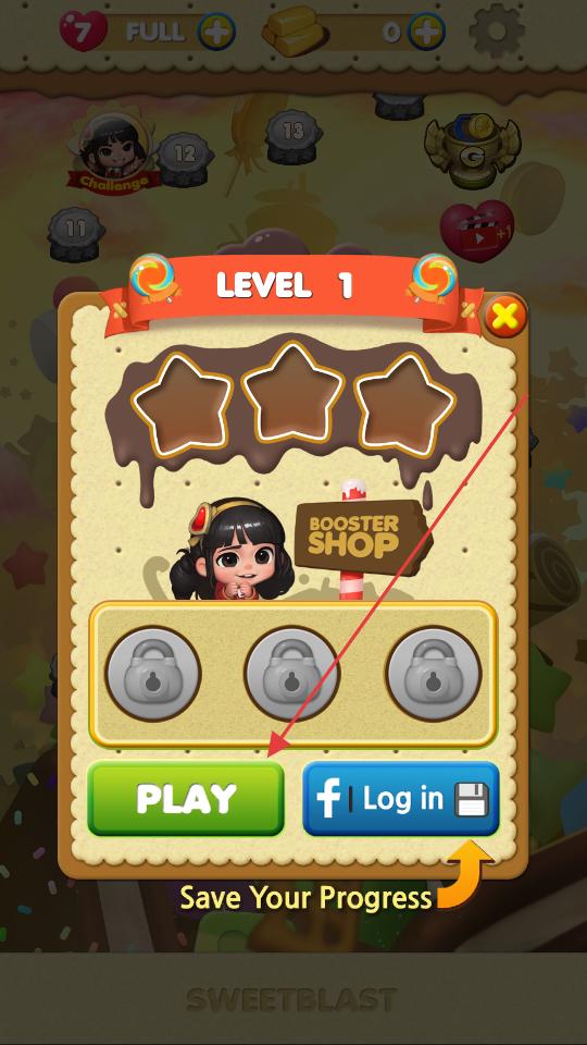 4、當需要進入新關卡時,在關卡選擇界面點擊PLAY按鈕,進入第一關的消除場景,開啟甜蜜的消除闖關挑戰(zhàn)。