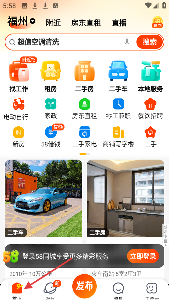1、首頁定位福州,有找工作、租房等多樣功能入口,展示二手車、二手房信息,可立即登錄享更多服務。