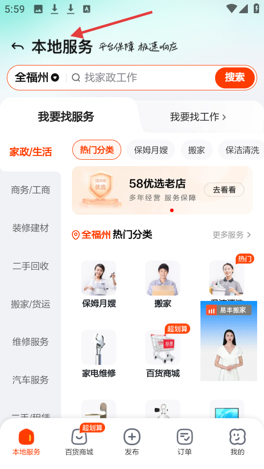 3、本地服務界面,可搜索服務或找工作,涵蓋家政生活、商務工商等分類,標注熱門服務,強調平臺保障。