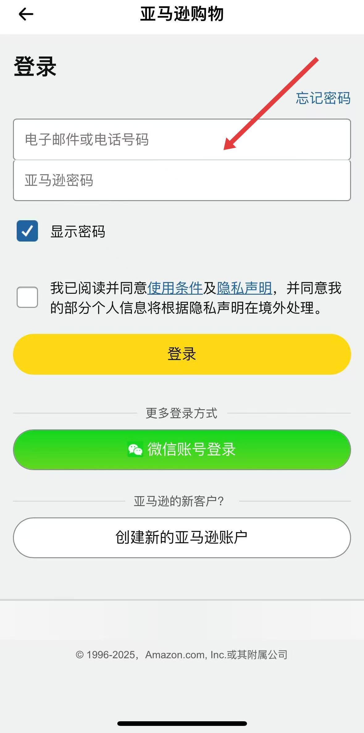 3、登錄頁面,用戶可輸入電子郵件或電話號碼、亞馬遜密碼進行登錄,還可選擇微信賬號登錄。