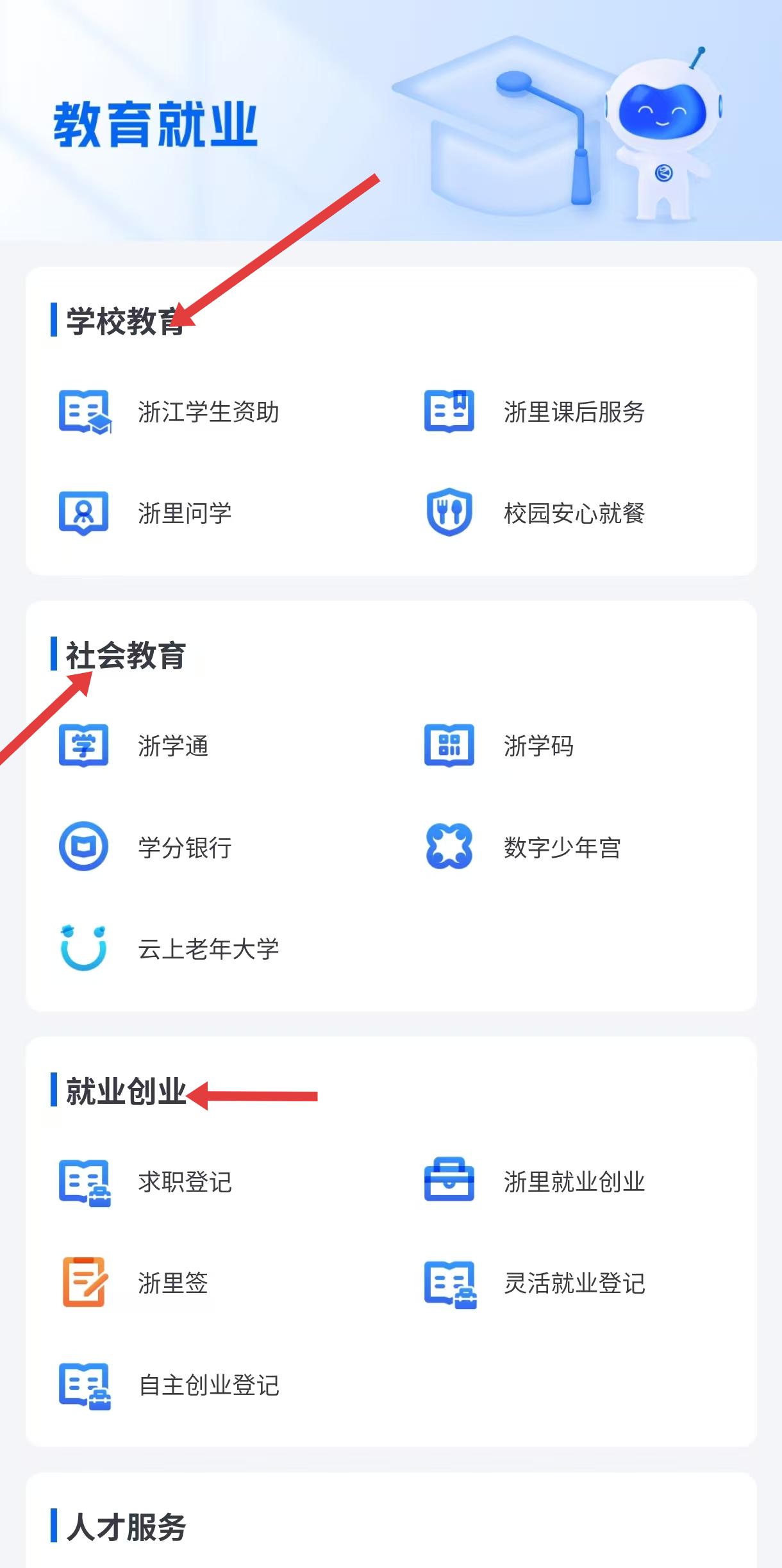2、教育就業(yè)板塊細(xì)分學(xué)校教育、社會教育、就業(yè)創(chuàng)業(yè),學(xué)校教育含學(xué)生資助、課后服務(wù),社會教育有浙學(xué)通、云上老年大學(xué)。