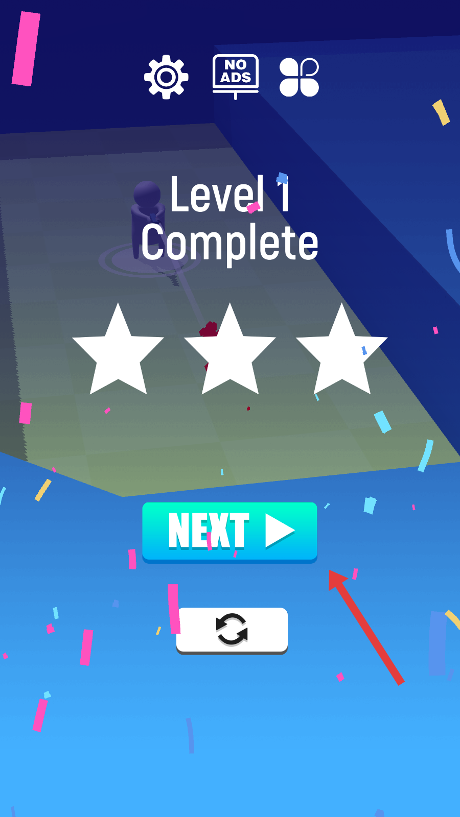 4、關(guān)卡1完成后,界面顯示三顆星,點(diǎn)擊下一個(gè),進(jìn)入下一關(guān),繼續(xù)射擊挑戰(zhàn)。