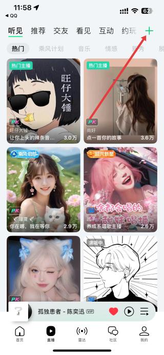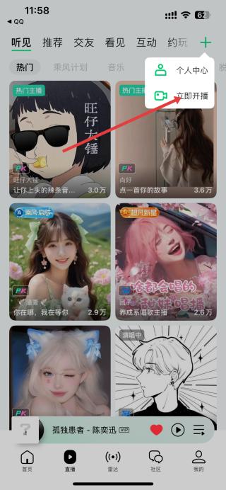 1、打開QQ音樂,進入首頁能看到推薦的主播內(nèi)容,點擊右上角加號,彈出個人中心、立即開播選項。