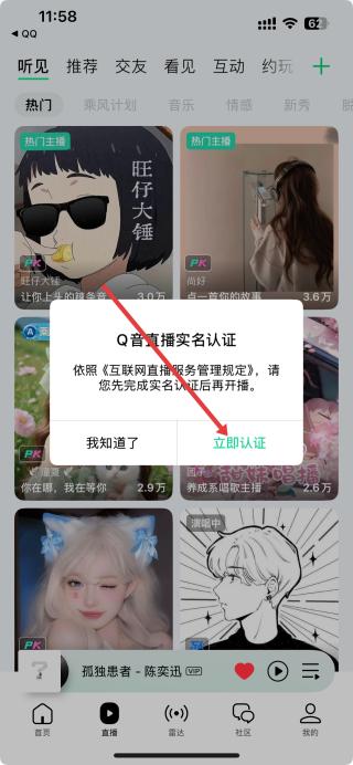 2、選擇立即開播,會彈出Q音直播實名認證提示框,依照規(guī)定需先完成實名認證才能開播,可點擊立即認證。