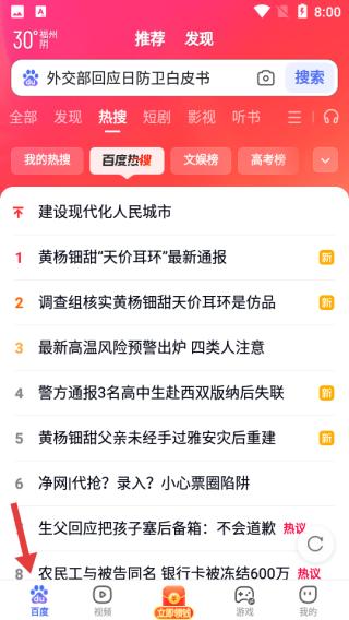 1、點擊首頁,頂部顯示天氣、推薦等,下方是百度熱搜,涵蓋社會熱點等多方面資訊,緊跟時事動態(tài)。
