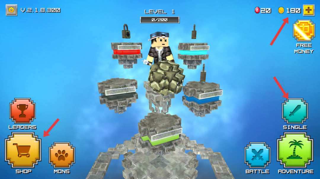 1、游戲主界面,可查看金幣、寶石數(shù)量,還有商店、冒險等功能按鈕點擊商店可購買道具,開啟相應(yīng)玩法。
