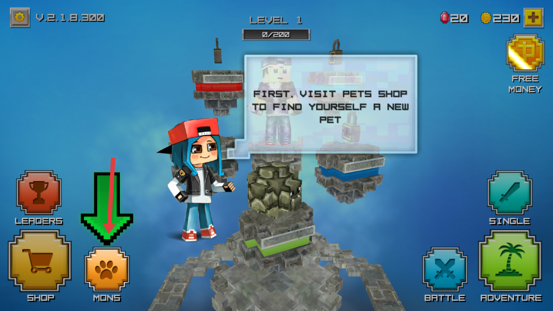 4、游戲提示先訪問寵物商店找新寵物,點擊按鈕進入寵物相關(guān)界面,挑選合適寵物,助力后續(xù)冒險、戰(zhàn)斗等游戲進程,提升游戲體驗。