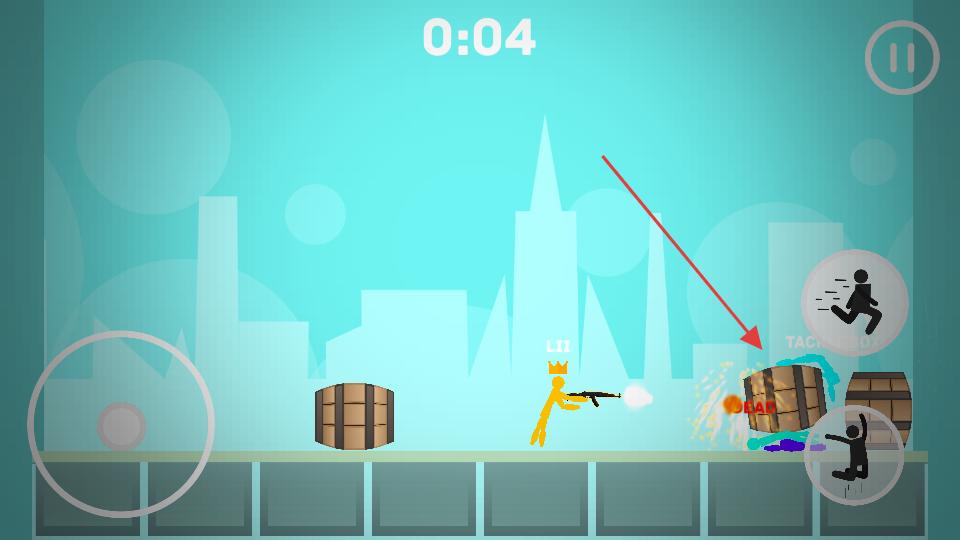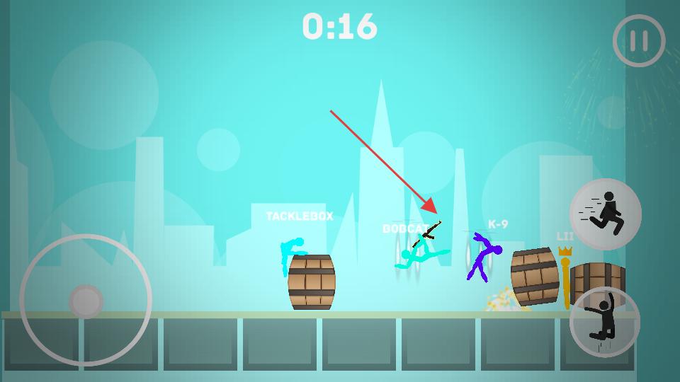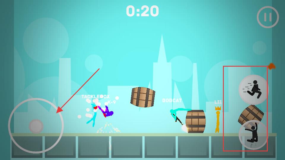 1、進(jìn)入城市亂斗場(chǎng)景左側(cè)搖桿控制火柴人移動(dòng),右側(cè)有奔跑和跳躍按鈕,操控火柴人在場(chǎng)景里移動(dòng),躲開(kāi)木桶等障礙物,找尋攻擊敵人的時(shí)機(jī)。