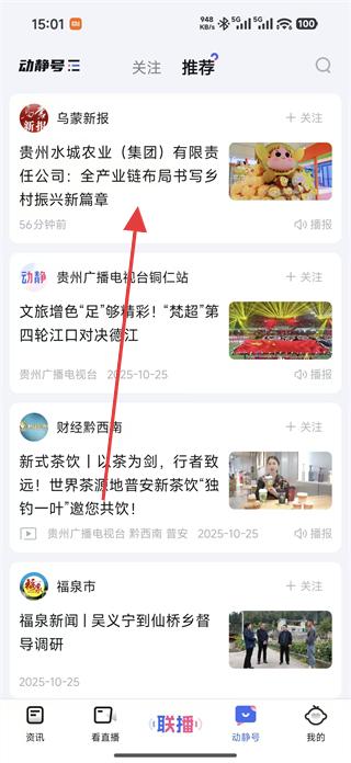 1、動靜號頁面瀏覽關(guān)注、推薦的資訊內(nèi)容,選擇烏蒙新報發(fā)布的貴州水城農(nóng)業(yè)集團有限責任公司相關(guān)文章,點擊進入文章詳情頁面。