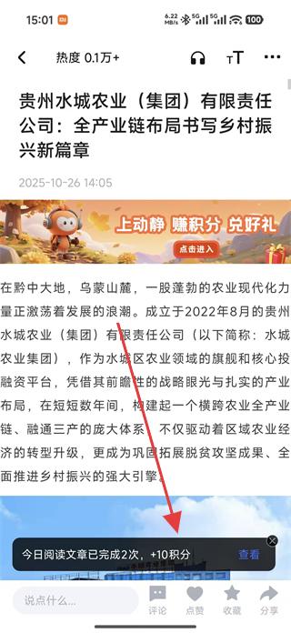 2、在文章詳情頁面可查看文章的發(fā)布時間、內(nèi)容等信息,還能看到今日閱讀文章完成次數(shù)及積分獎勵提示。