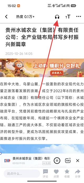 3、點擊頁面上方的耳機圖標,開啟文章的語音收聽功能,此時會彈出語音播放控件。