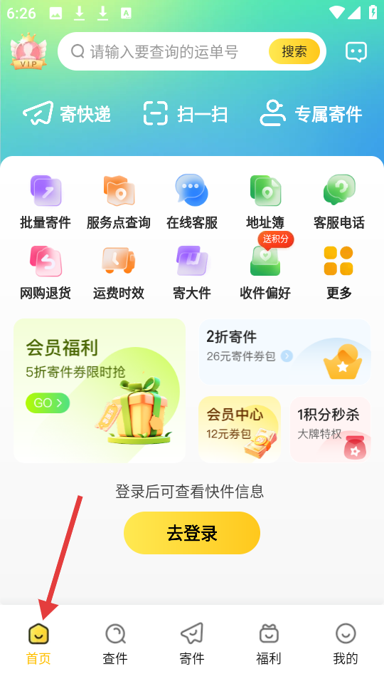 1、首頁(yè)頂部設(shè)運(yùn)單號(hào)搜索框,寄快遞等功能醒目,中部展示會(huì)員福利,底部導(dǎo)航含查件、寄件等選項(xiàng)。