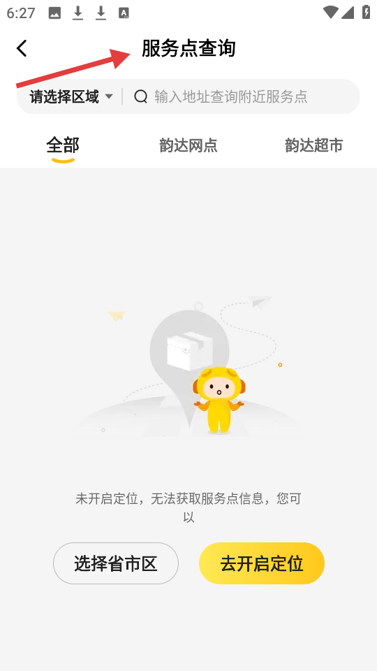 2、服務(wù)點(diǎn)查詢頁(yè)支持區(qū)域選擇與地址輸入查找,因定位未開(kāi),提示可手動(dòng)選省市區(qū)或開(kāi)啟定位獲取服務(wù)點(diǎn)信息。