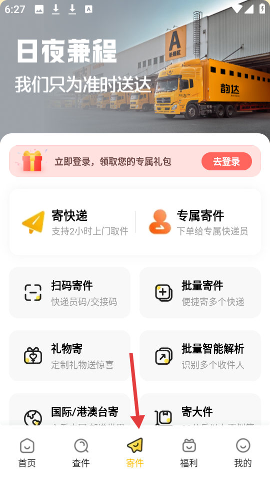 3、寄件界面,以韻達(dá)運(yùn)輸場(chǎng)景為背景,提供多種寄件方式,如專屬寄件、批量寄件等,滿足不同寄件需求。