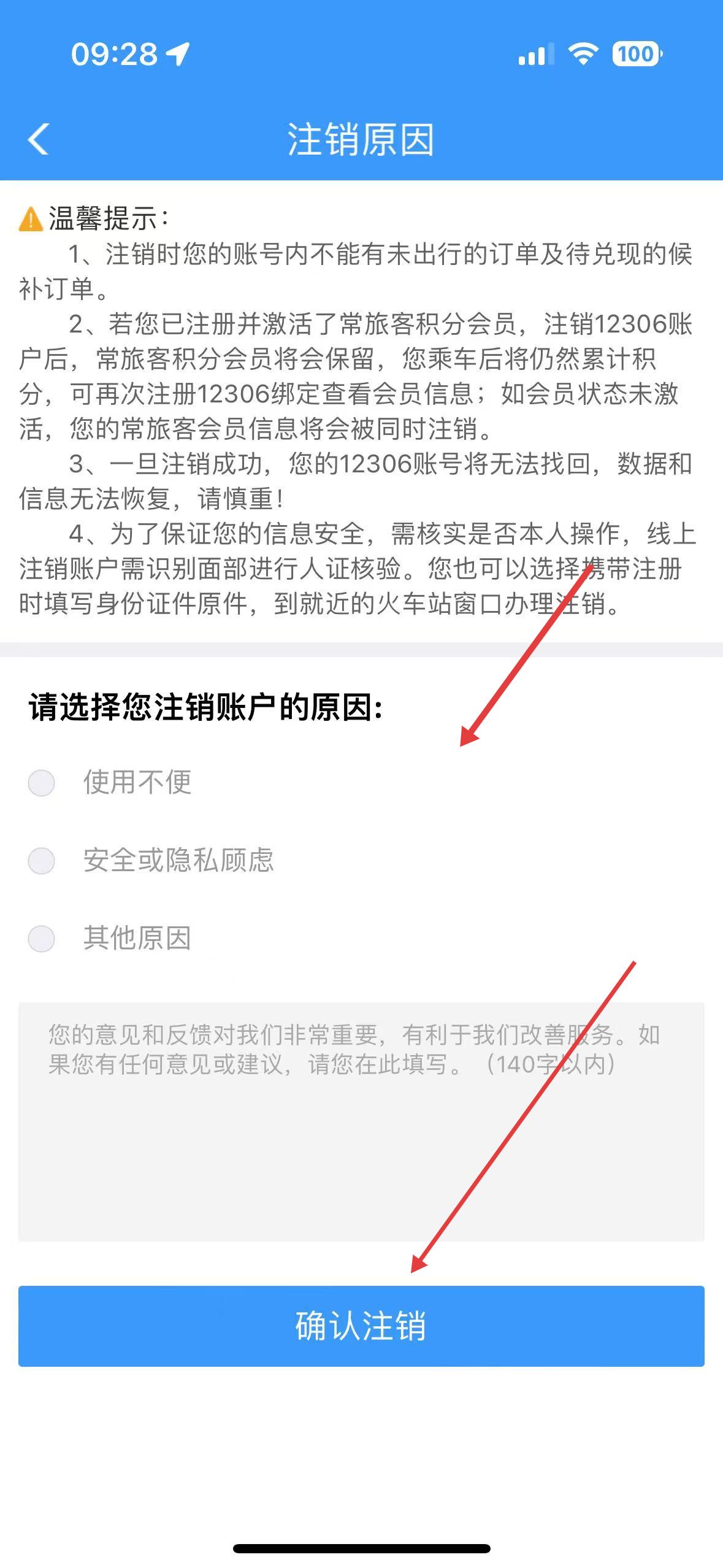 3、注銷原因頁(yè),要選使用不便等原因,確認(rèn)后點(diǎn)確認(rèn)注銷,且注銷前需確保無(wú)未出行訂單等。