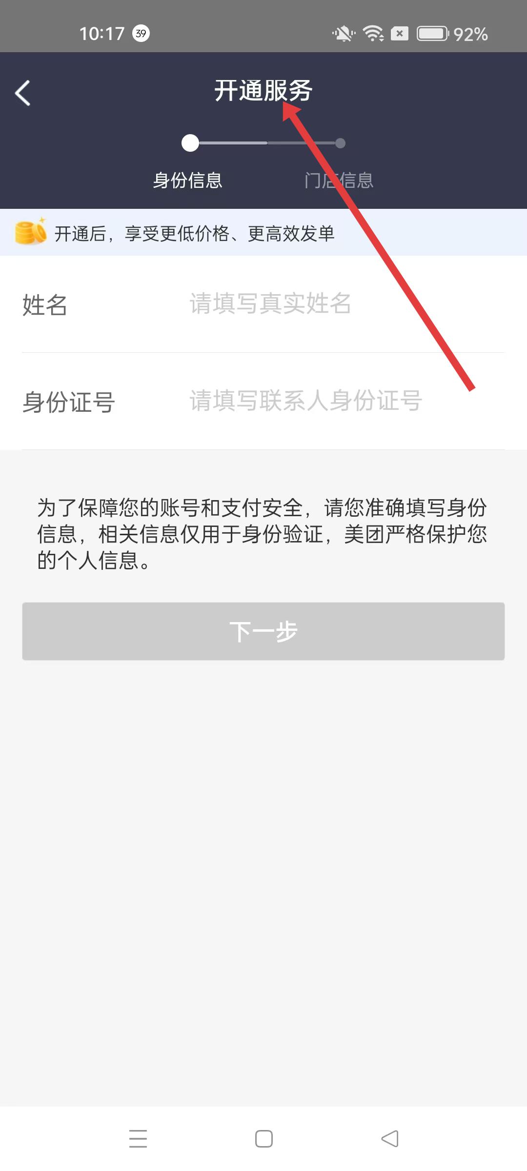 2、開(kāi)通服務(wù)界面,先填寫(xiě)身份信息,包括姓名、身份證號(hào)等,填寫(xiě)完成后進(jìn)入下一步。