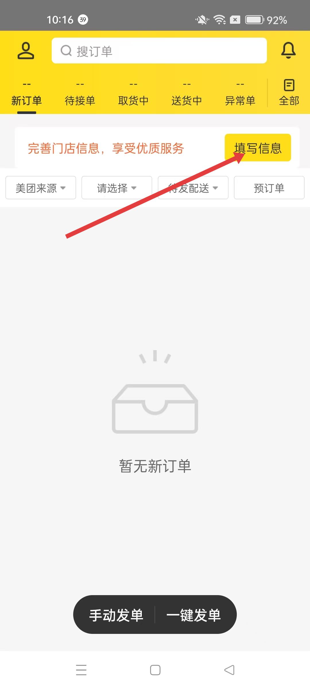 1、進(jìn)入美團(tuán)商戶端訂單界面后,點(diǎn)擊填寫(xiě)信息選項(xiàng),進(jìn)入開(kāi)通服務(wù)流程。
