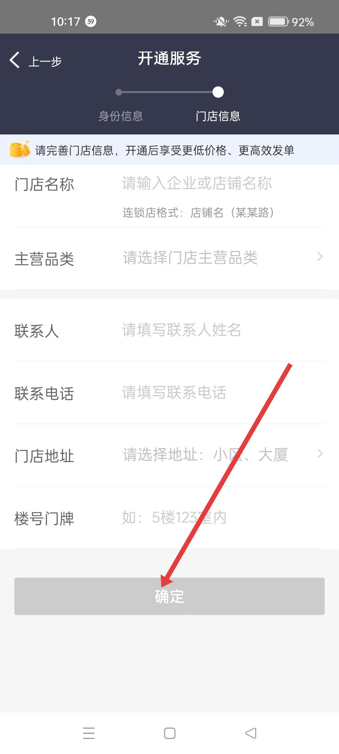3、接著填寫(xiě)門(mén)店信息,包括門(mén)店名稱、主營(yíng)品類、聯(lián)系人、聯(lián)系電話、門(mén)店地址等,填寫(xiě)完成后點(diǎn)擊確定按鈕。