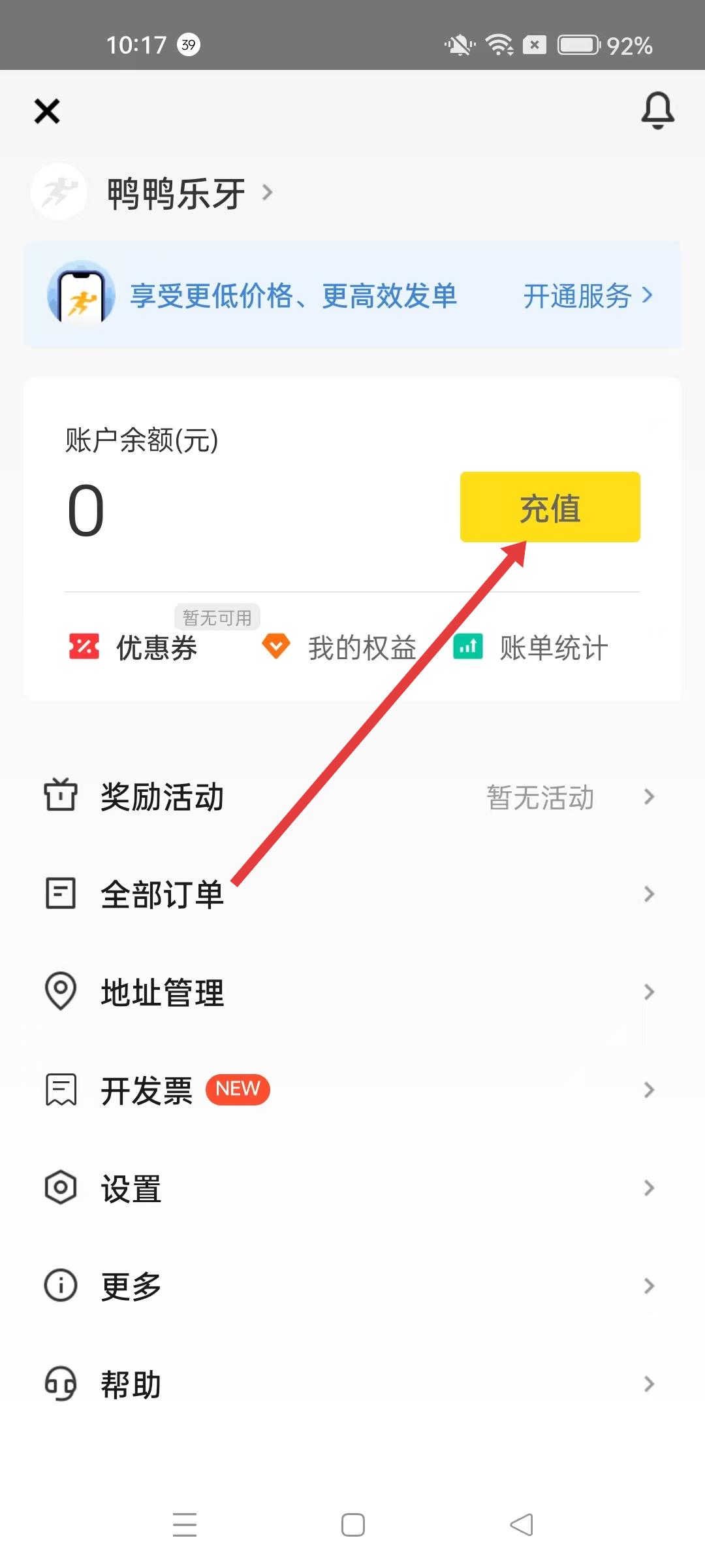 4、服務(wù)開(kāi)通后,可個(gè)人頁(yè)面進(jìn)行賬戶充值等操作,以便使用美團(tuán)商戶端的發(fā)單等服務(wù)。