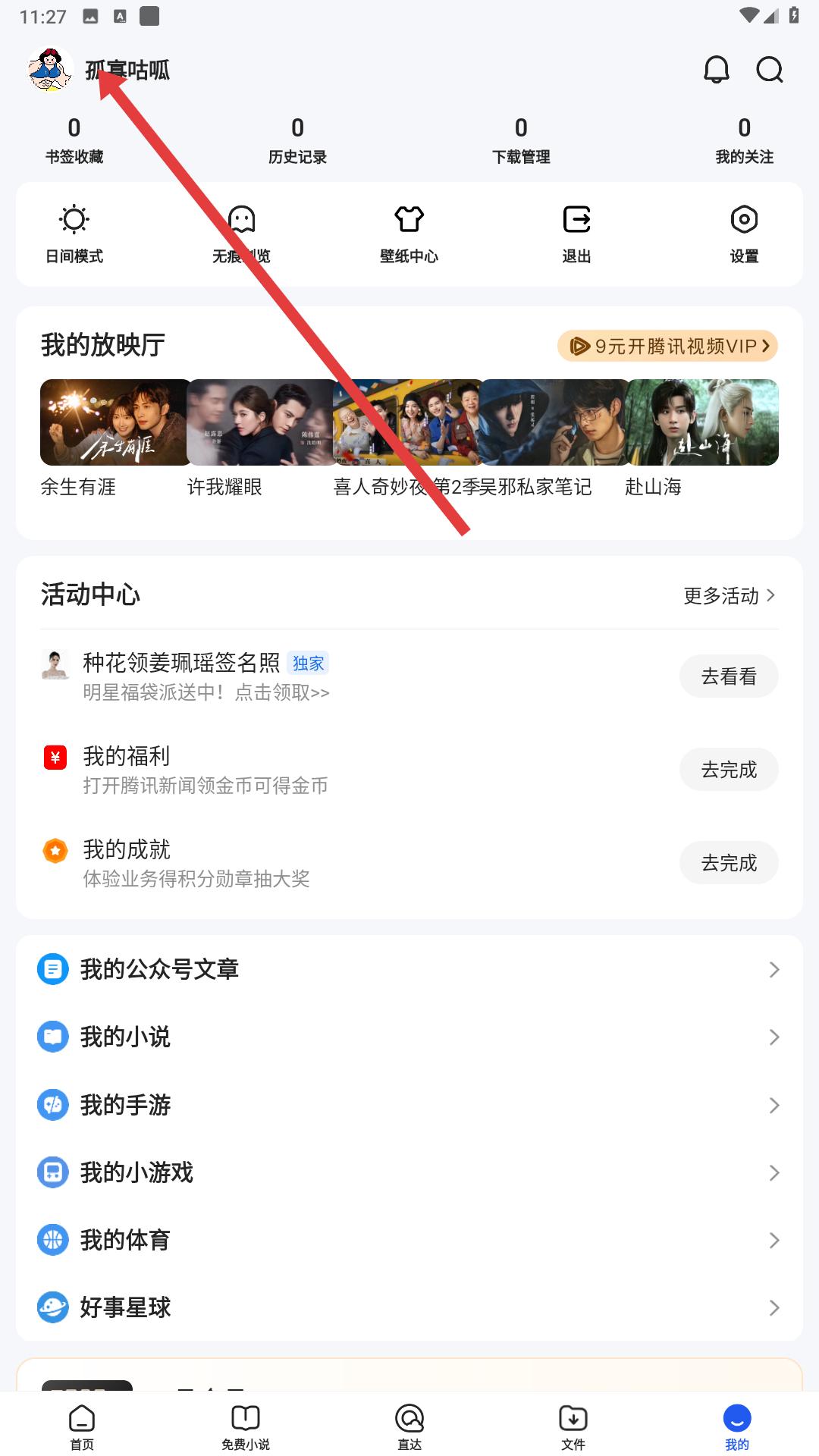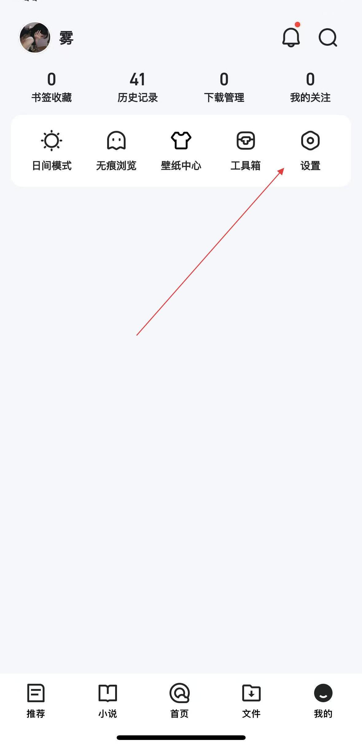 1、我的個人主頁里,能看到頂部陳列著書簽收藏、歷史記錄等信息,點擊設(shè)置即可進入應(yīng)用的系統(tǒng)設(shè)置界面。