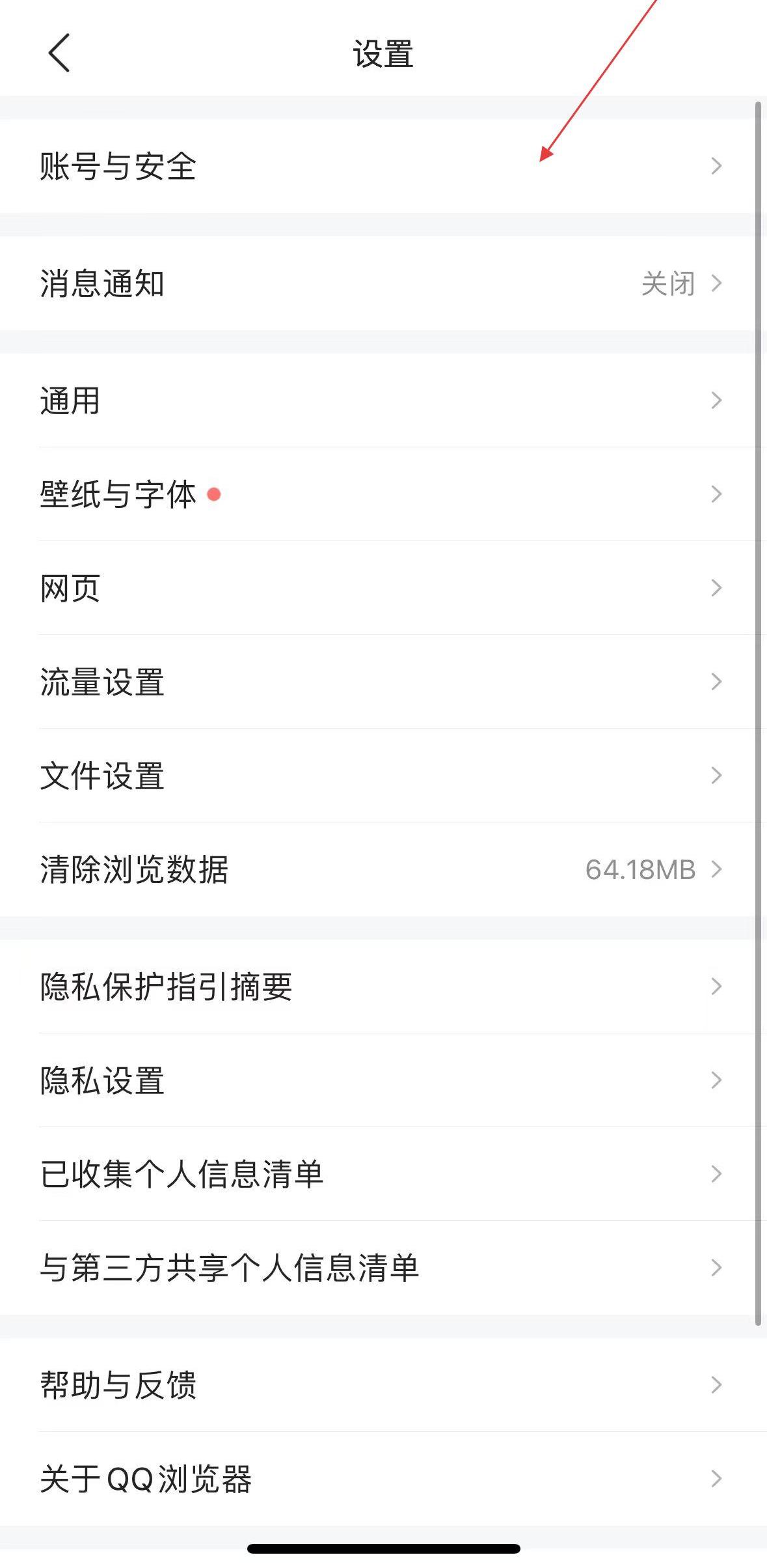2、進入設(shè)置頁面后,列表中第一個選項就是賬號與安全,點擊它可進入專門的賬號安全管理板塊。