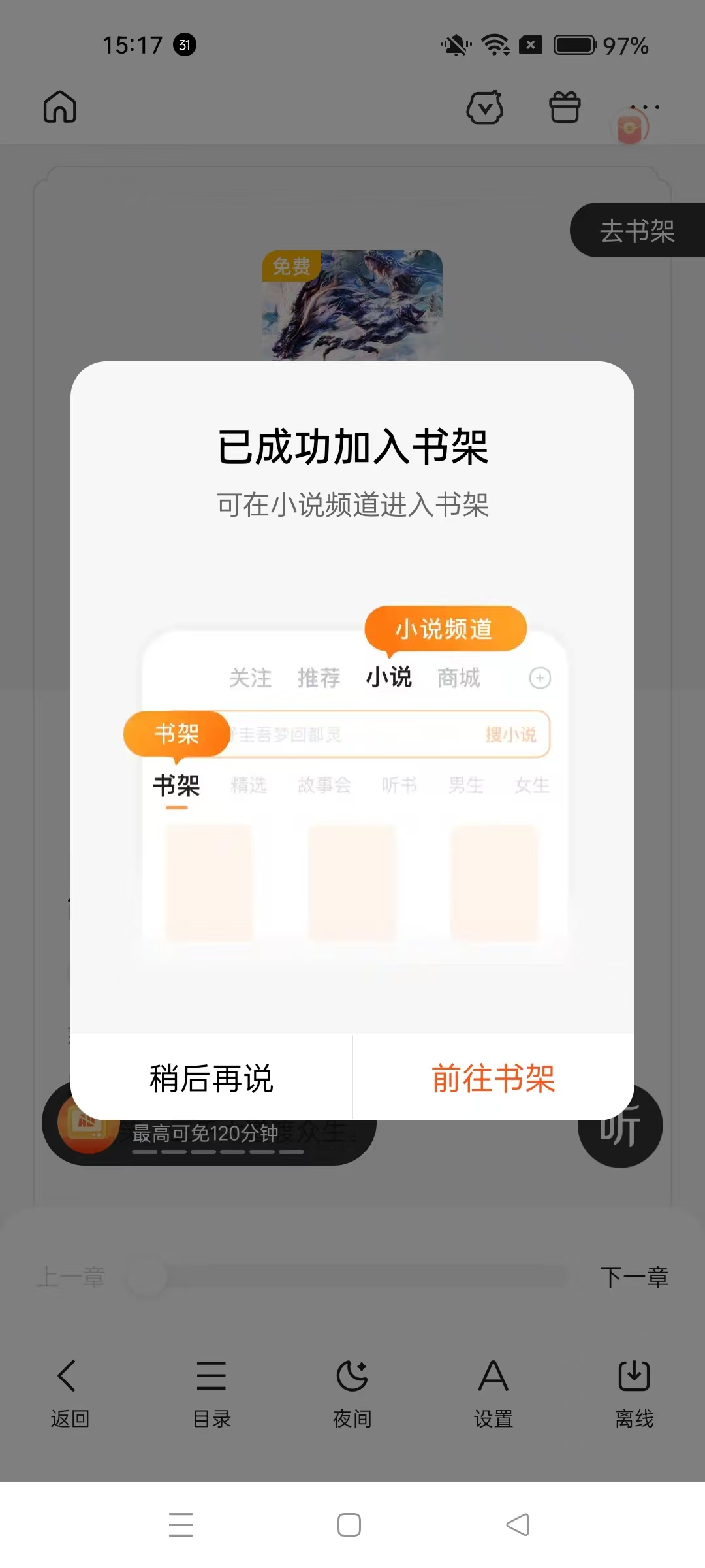 4、點擊加入書架后,會彈出已成功加入書架的提示,可選擇稍后再說或前往書架,方便用戶后續(xù)查找閱讀該小說。
