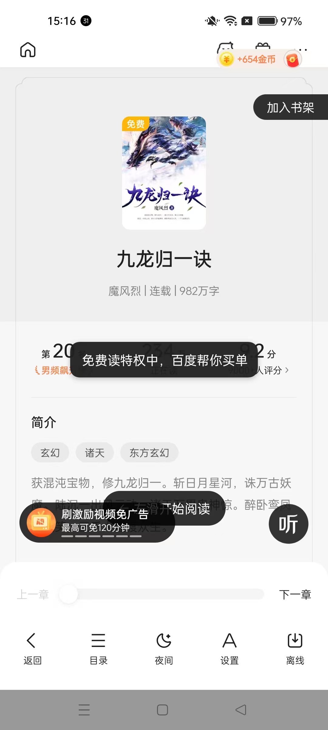 3、打開某本小說如九龍歸一訣,可看到小說簡介、類型,有加入書架、開始閱讀、聽書等功能,底部有返回、目錄、夜間等操作入口。