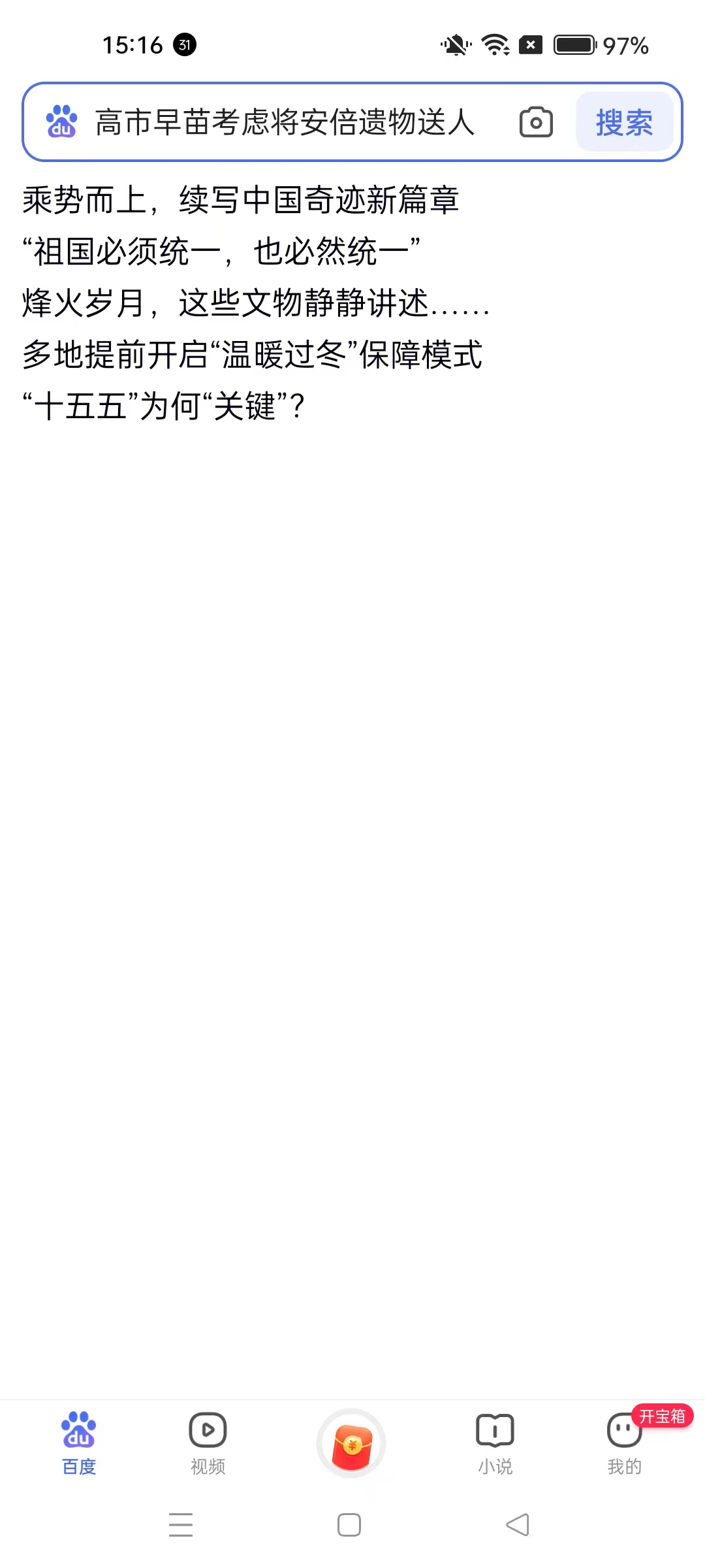 1、進(jìn)入百度APP首頁,頂部有搜索欄可搜索內(nèi)容,下方有各類資訊推薦,底部有百度、視頻、小說等功能入口,可切換到小說板塊。